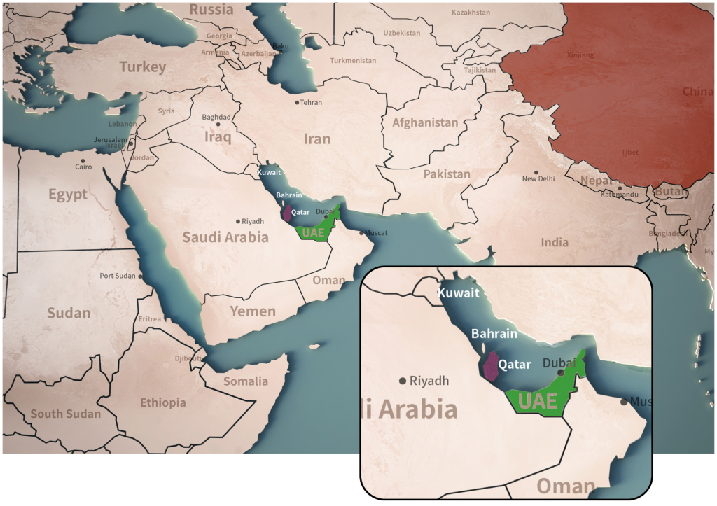 Qatar (pronounced “kuh-TAR”) is a peninsular Arab country of roughly 2.8 million residents. It borders Saudi Arabia and the Persian Gulf, and shares a maritime border with the United Arab Emirates (via the Persian Gulf). You may recall Qatar hosted the FIFA World Cup in 2022.